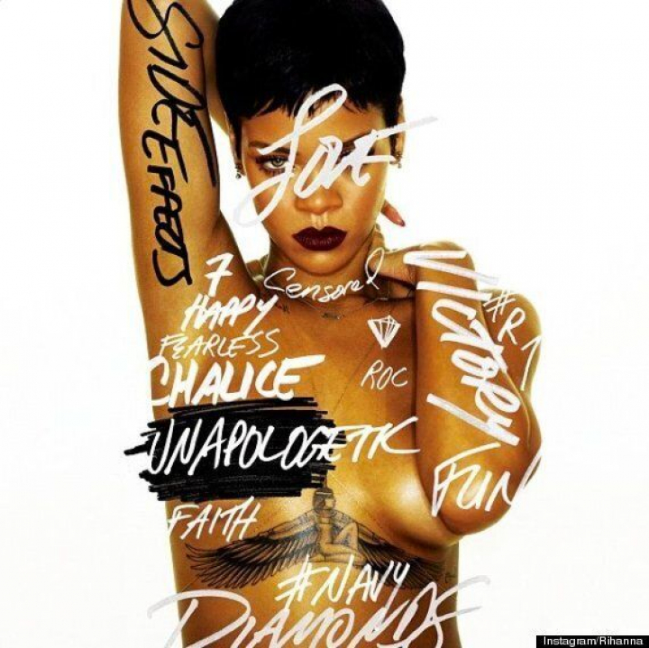 RiRi se quitó todo para la portada de Unapologetic. La imagen creó gran revuelo en redes sociales, también era la primera vez que dejaba ver su tatuaje de debajo del pecho, aunque para tapar sus pezones se alió con los editores de imagen y esos grafittis que incluyen los títulos de las canciones.