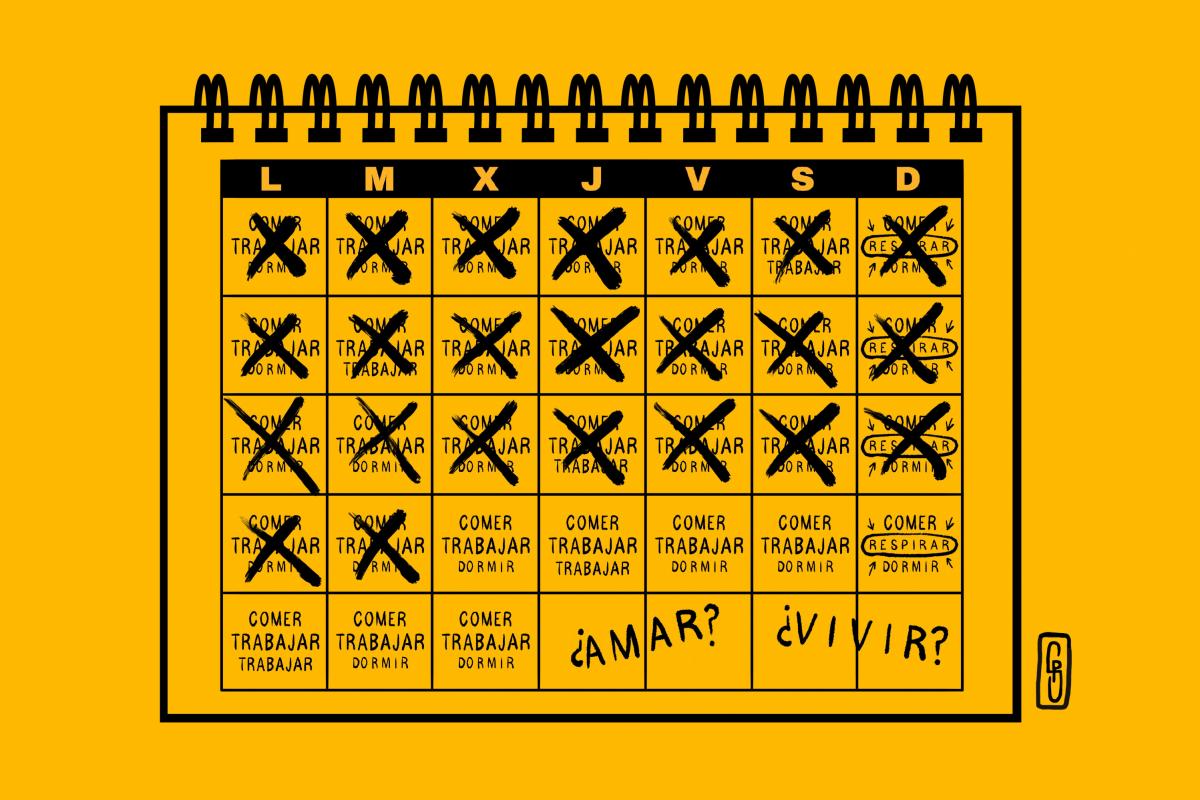 ¿Qué hay del resto de la población? Bueno, la situación no es muy distinta: de lunes a viernes, trabaja ocho horas diarias, suma una de ida y otra de vuelta; llega a casa, haz la cena y la comida del día siguiente; plancha lo que te vas a poner; con suerte habla con tu pareja, tus compañeros de piso o tus familiares y a dormir; que mañana más de lo mismo. El sábado, descansa de la semana que te has echado a hombros; el domingo, haz la compra de la semana y, si te sobra tiempo, disfruta.