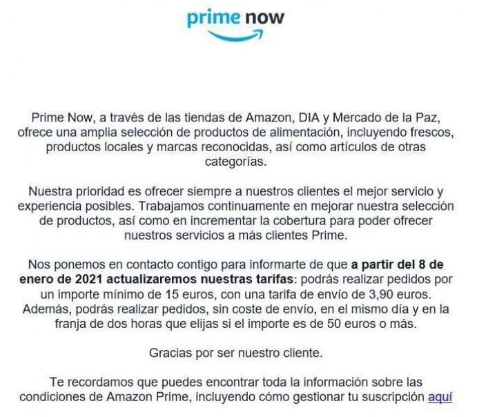 Inicialmente, el pedido mínimo de la cesta de la compra en Prime Now para que el usuario no tuviera que pagar gastos de envío se situaba en 19 euros. Un importe que se elevó hasta los 40 euros en octubre de 2017. A partir del próximo 8 de enero se eleva a 50 euros.