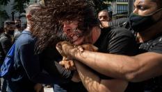 La madre del palestino Hussein al-Titi, de 26 años, asesinado por disparos israelíes en el campo de refugiados de Fawwar, cerca de la ciudad de Hebrón, en la ocupada Cisjordania, llora su cuerpo