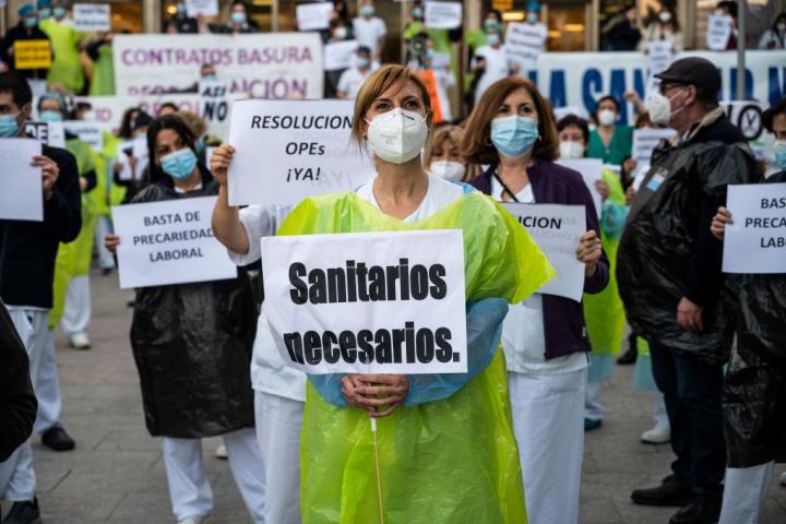 En el inicio, el personal sanitario trabajó sin equipos de protección individual (EPI) suficientes, lo que colocó en abril a España como el país europeo con más infecciones en este ámbito. Más de 123.603 profesionales de la salud se han contagiado de coronavirus y 89 han fallecido a día de hoy.