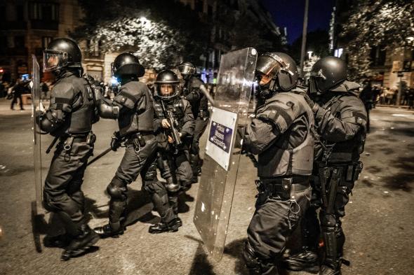 Agentes antidisturbios durante las protestas que se han producido este viernes ante la comisaría de la Policía Nacional de Via Laietana, en Barcelona