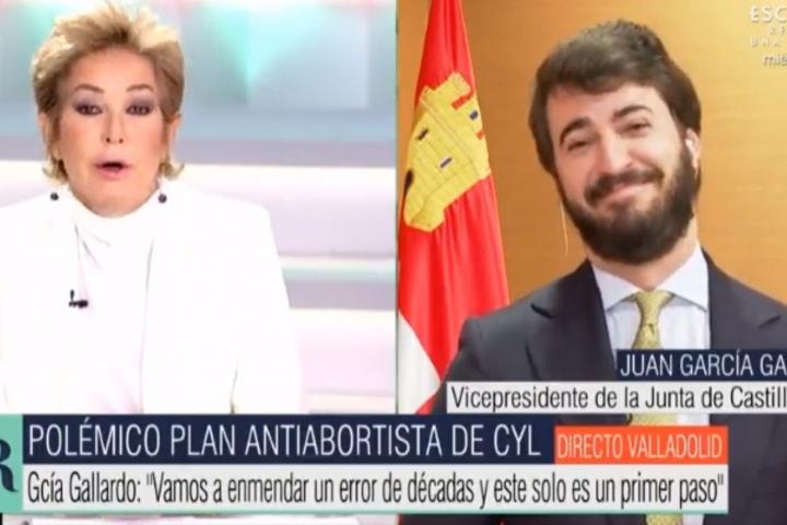 Máxima tensión entre Ana Rosa Quintana y el vicepresidente de Castilla y León, Juan García-Gallardo. La presentadora de Telecinco le ha dejado claro al dirigente de Vox sus rechazo al plan antiaborto que la Junta comenzará a aplicar desde este lunes en su territorio. Dicho protocolo establece que los médicos se vean obligados a ofrecer a todas las mujeres embarazadas, quieran abortar o no, la posibilidad de escuchar el latido del feto y una ecografía en 4D.