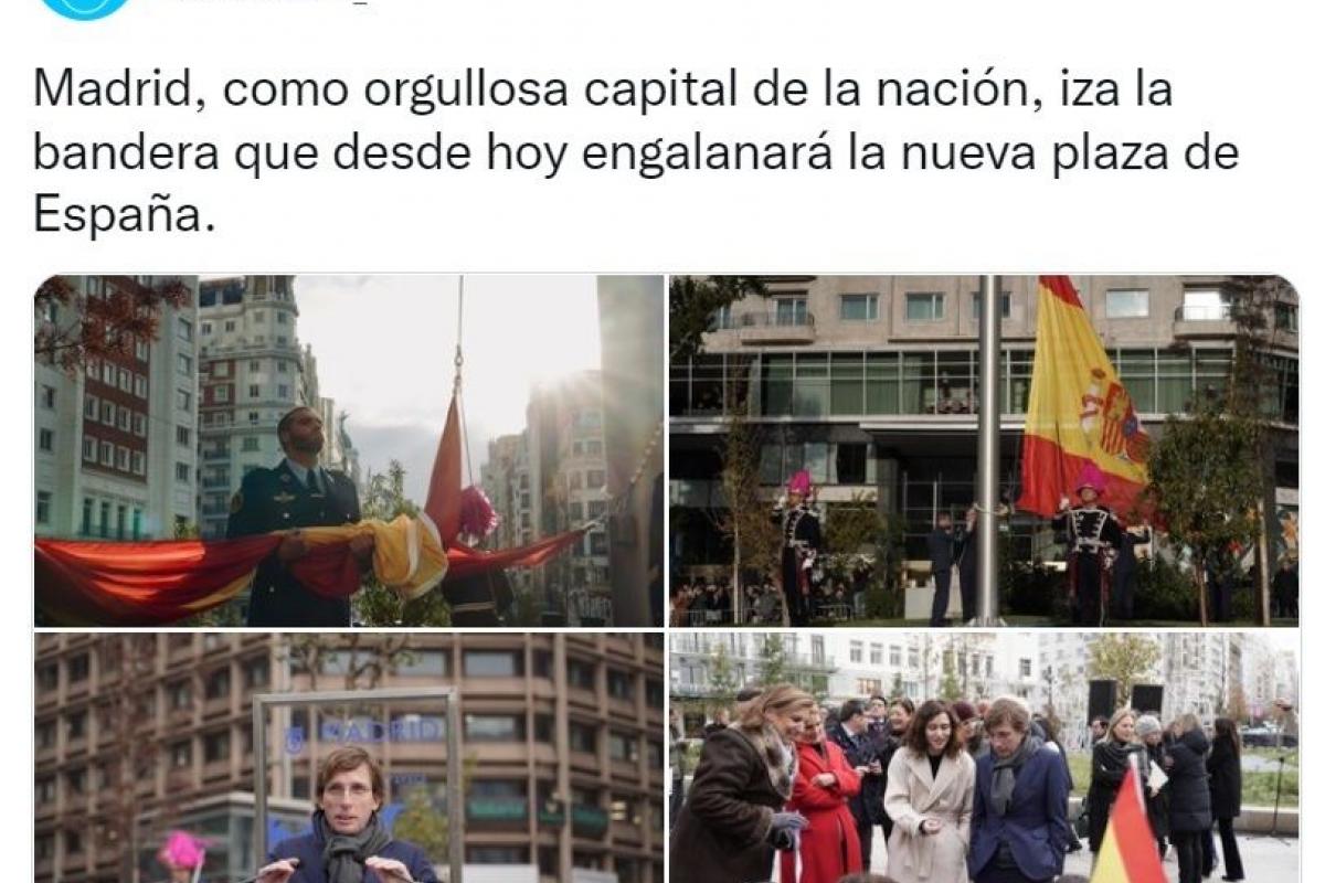 Pero, tras el acto, Almeida subió cuatro fotos y un mensaje a su cuenta de Twitter. En el escrito, aseguró que “Madrid, como orgullosa capital de la nación, iza la bandera que desde hoy engalanará la nueva plaza de España”.