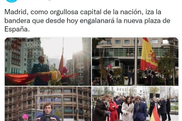 Pero, tras el acto, Almeida subió cuatro fotos y un mensaje a su cuenta de Twitter. En el escrito, aseguró que “Madrid, como orgullosa capital de la nación, iza la bandera que desde hoy engalanará la nueva plaza de España”.
