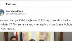 “Que se presenten los Yihadistas a las elecciones, seguro que sacan algún escaño. VERGONZOSO LO QUE ESTÁ PASANDO EN ESTE PAÍS!!!!!”, dice el tuit escrito el sábado por la noche, que a primera hora del domingo acumulaba 14.000 me gusta y superaba los 3.500 retuits. Entre los comentarios, muchas críticas y un apoyo incondicional, el del cantante José Manuel Soto.