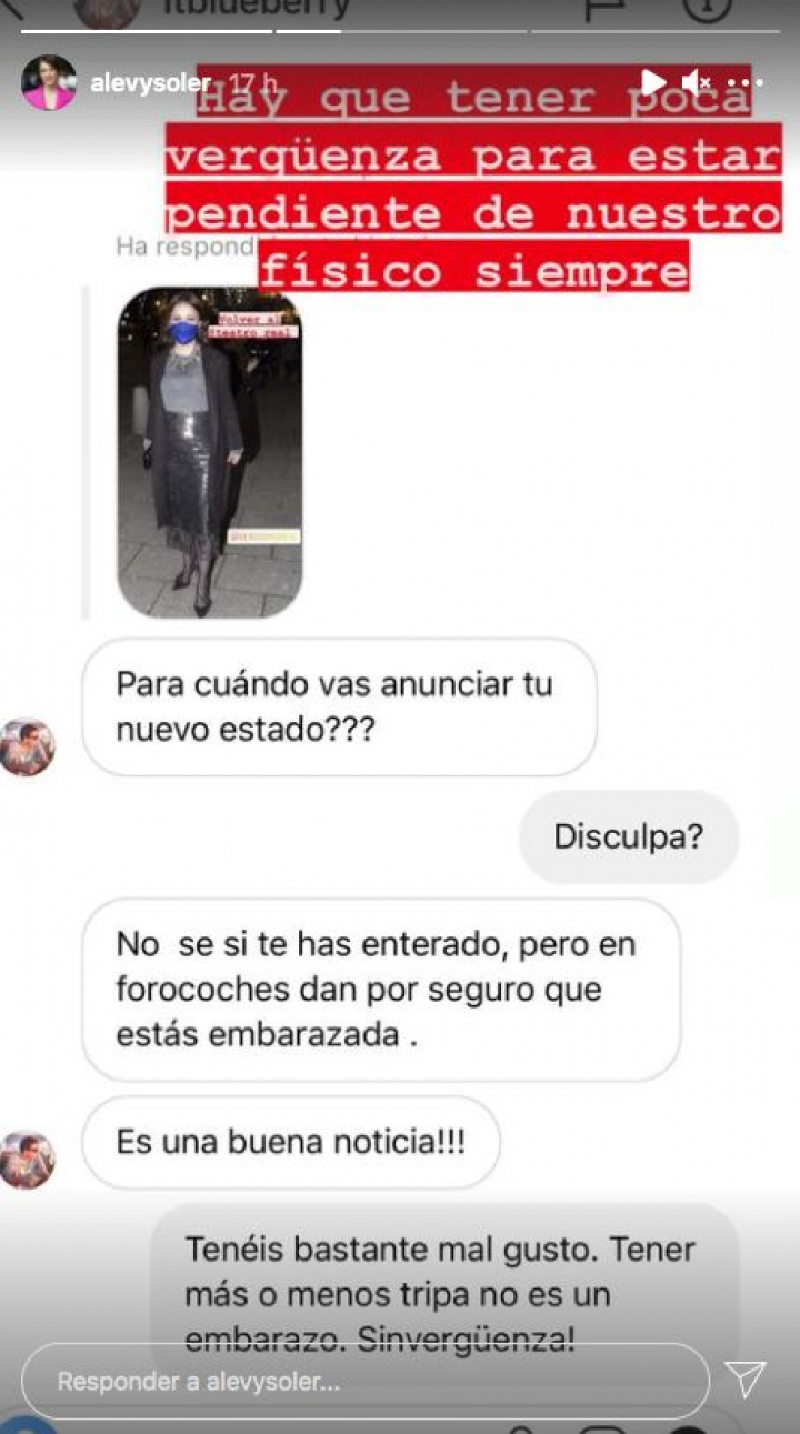 Levy contestó bastante molesta: “Tenéis bastante mal gusto. Tener más o menos tripa no es un embarazo. ¡Sinvergüenza!”.