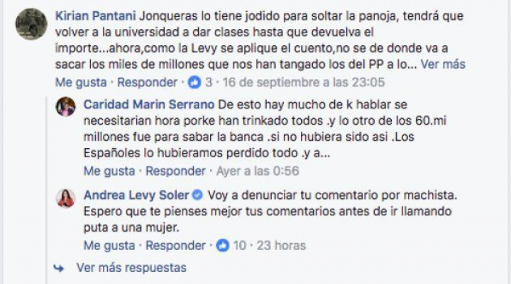 De inmediato, Levy replicó: "Voy a denunciar tu comentario por machista. Espero que te pienses mejor tus comentarios antes de ir llamando puta a una mujer".