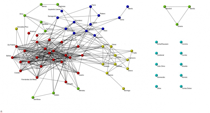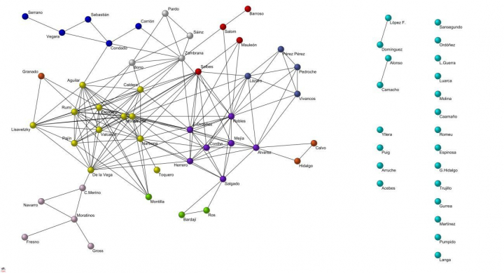 El gráfico del PP tiene más cohesión (más lazos entre los nodos o dirigentes, menos nodos aislados; la densidad como medida de cohesión es dos veces mayor a la del PSOE). Esto es consecuencia de que el equipo de Rajoy es el de Aznar, con gaseosa: más años todos juntos, da lugar a una élite muy organizada.
