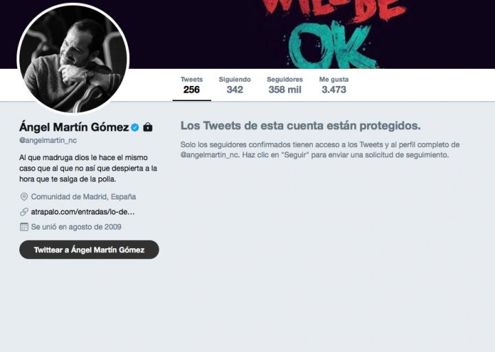“Estoy hasta el rabo de tanto de tanto ofendido. Ahora esta cuenta es privada para dejar claro que si decides quedarte o entrar, es bajo tu responsabilidad. Nadie te obliga”, dice su único tuit visible por el momento (y solo para los autorizados).