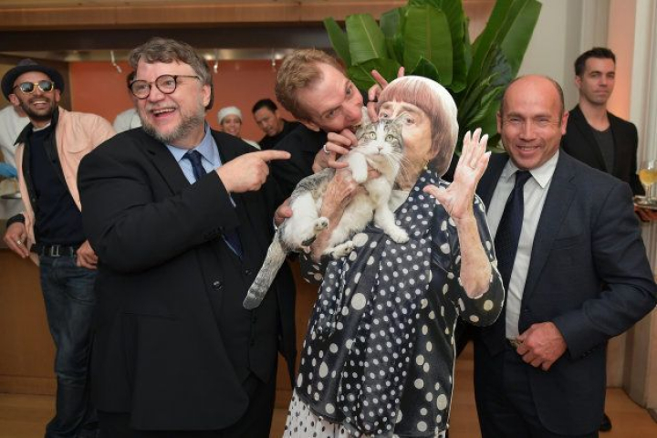 Guillermo del Toro, Doug Jones, y J. Miles junto a una de las copias con Agnès Varda en la cena de nominados a los Oscar 2018.Neilson Barnard via Getty Images