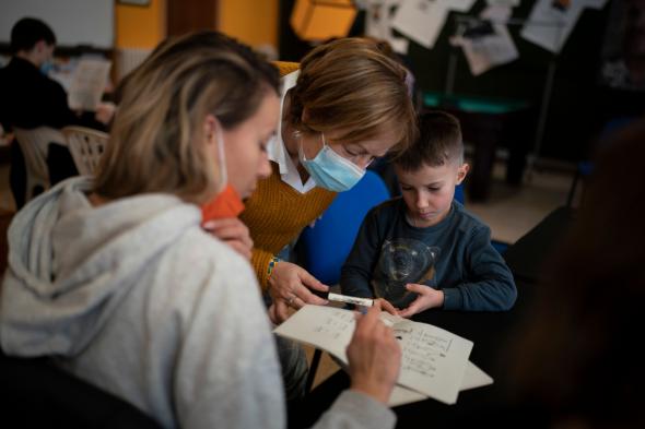 Mujeres preocupadas por haber dejado a sus maridos o a sus hijos adolescentes en el frente, niños aterrorizados por el sonido de las bombas, personas mayores que han abandonado sus hogares a los que no saben si volverán algún día. Son las personas que pasan cada día por los centros de recepción de refugiados habilitados por el Gobierno en Pozuelo de Alarcón (Madrid), en la Ciudad de la Luz de Alicante y en la Fira de Barcelona.