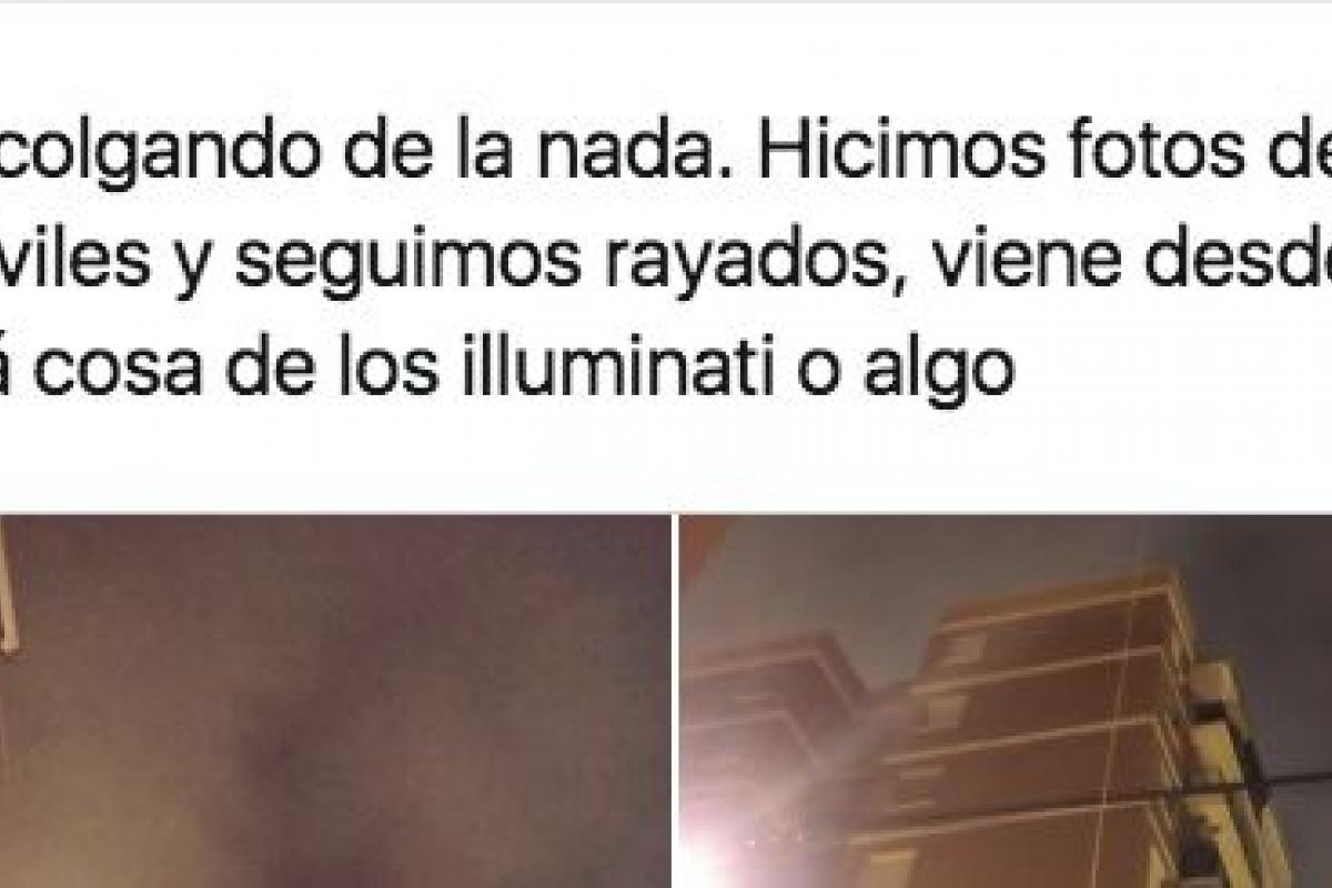 “Anoche con unos amigos vi este cable... Que está colgando de la nada. Hicimos fotos desde varios móviles y seguimos rayados, viene desde el puto cielo. Será cosa de los Illuminati o algo”, ha escrito en Twitter.