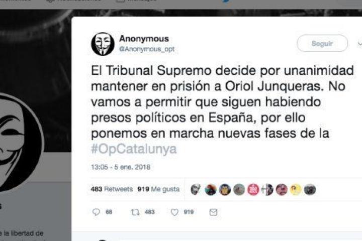 Anonymous prepara nuevos ciberataques como respuesta a la decisión del Tribunal Supremo de mantener en prisión al líder de ERC, Oriol Junqueras. Nuevas fases de la 'Operación Cataluña', según ha anunciado el colectivo de hackers a través del perfil en Twitter @Anonymous_opt. "No vamos a permitir que siguen habiendo (sic) presos políticos en España", aseveran.