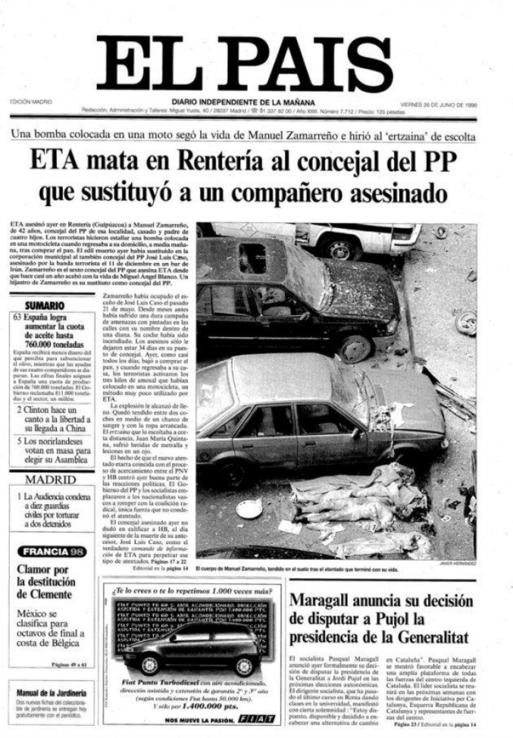 La expulsión forzada en grado de tentativa -porque fueron muy valientes y resistieron la tremenda persecución- de Manuel Zamarreño y José Luis Caso [ambos concejales del PP en Rentería, Guipúzcoa], y su sucesivo asesinato selectivo, primero de uno y luego del otro que se atrevió a ocupar su lugar. Incomprensiblemente, siguen impunes. No creo ser capaz de recalcar suficientemente el valor de y el compromiso con nuestras libertades de ambos.
