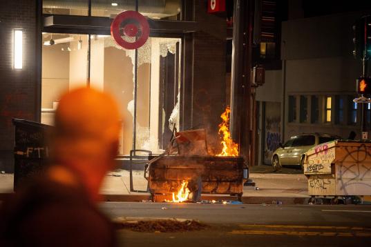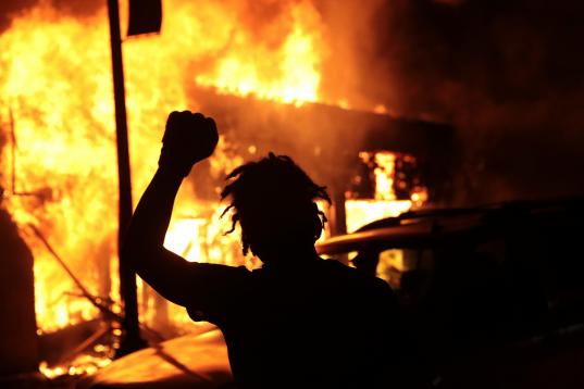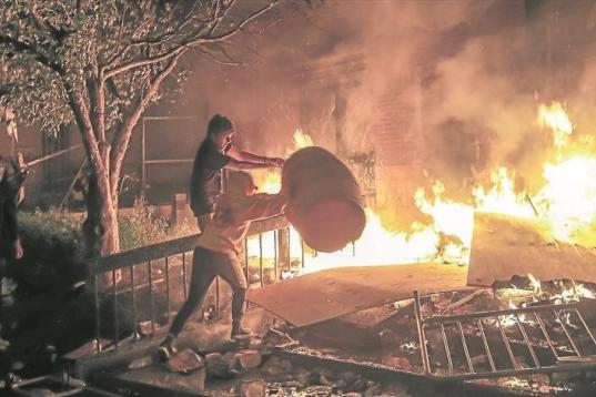 Un grupo de manifestantes participa en la quema de una comisaría en Minneapolis.