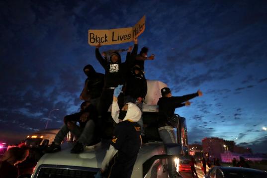 Protestors celebrate after eluding authorities and stopping traffic along Interstate 55 in Memphis, Tennessee, Sunday, May 31, 2020, during a protest over the death of George Floyd on May 25. (Patrick Lantrip/Daily Memphian via AP)