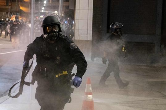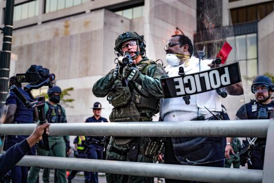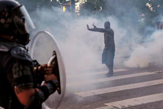 A protester tries to talk the police back amid tear gas in downtown Atlanta, Sunday, May 31, 2020. Protests continue across the country over the death of George Floyd, a black man who died after being restrained by Minneapolis police officers on...