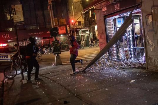 People break into a smoke shop on Monday, June 1, 2020, in New York. Protests were held throughout the city over the death of George Floyd, a black man in police custody in Minneapolis who died after being restrained by police officers on Memori...