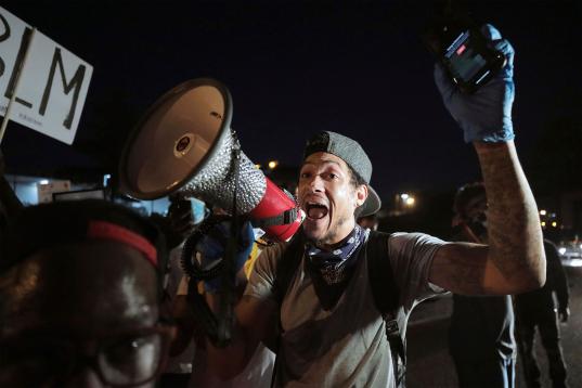 A police officer shouts to members of the media while trying to clear the streets of demonstrators in Memphis, Tennessee, early Monday, June 1, 2020, protesting the death of George Floyd who died in Minneapolis police custody May 25, 2020. (Da...