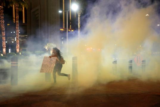 A protester runs through tear gas on the Las Vegas Strip on Sunday, May 31, 2020, in Las Vegas, during demonstrations over the death of George Floyd, who died May 25 after he was pinned at the neck by a Minneapolis police officer. (AP Photo/Stev...