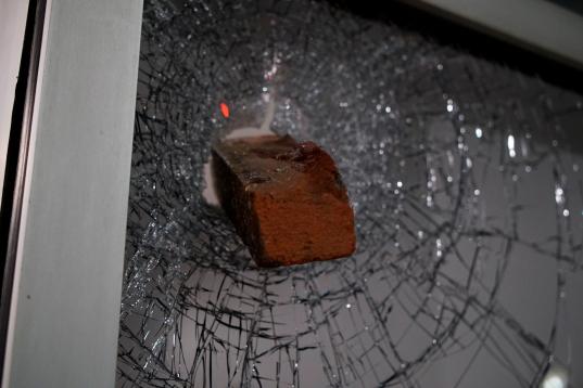 A brick protrudes from a shattered window in downtown Raleigh, N.C., on Monday, June 1, 2020. It was the second day of protests in the North Carolina capital following the death of Minnesotan George Floyd while in police custody. (AP Photo/Allen...