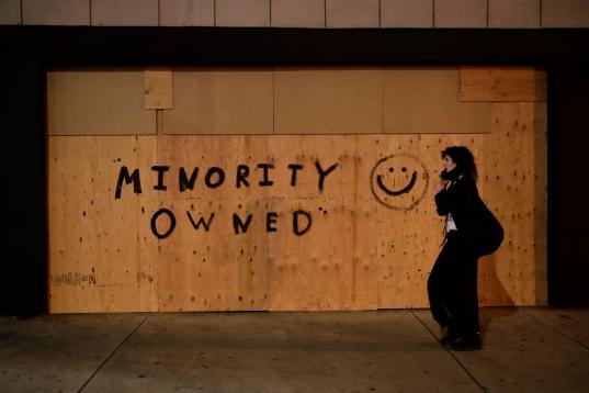 A woman walks past a store boarded up with a message as protests over the death of George Floyd continue Sunday, May 31, 2020, in Los Angeles. Armed National Guard soldiers lined the steps of Los Angeles City Hall, and cities across California d...