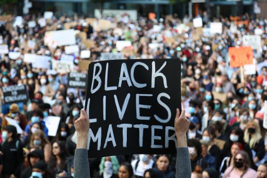 AUCKLAND, NEW ZEALAND - JUNE 01: Protestors march down Queen Street on June 01, 2020 in Auckland, New Zealand. The rally was organised in solidarity with protests across the United States following the killing of an unarmed black man George Floy...