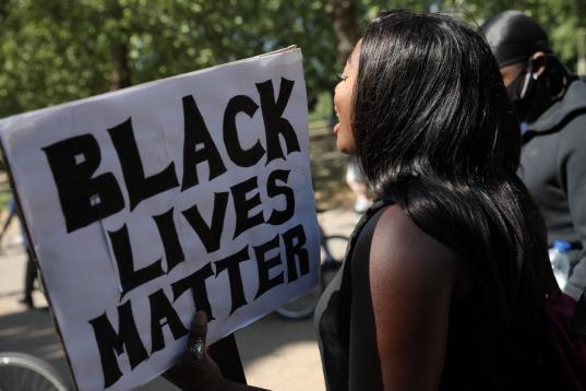 LONDON, ENGLAND - JUNE 01: Protesters take part in a 'Black Lives Matter' demonstration on June 01, 2020 in London, England. Protests and riots continue across American following the death of George Floyd, who died after being restrained by Minn...