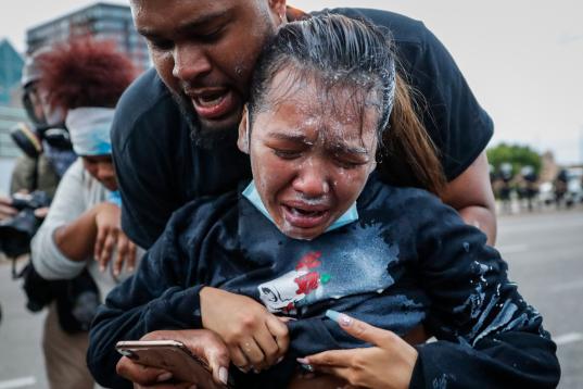 A protester reacts after being hit by pepper spray from police as their group of demonstrators are detained prior to arrest at a gas station on South Washington Street, Sunday, May 31, 2020, in Minneapolis. Protests continued sparked by the deat...