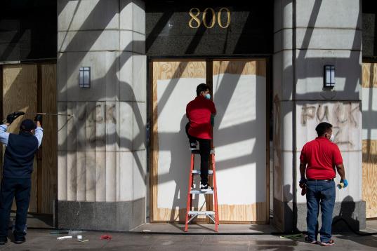 People remove graffiti near the White House after a third night of violent protests over the death of George Floyd on June 1, 2020, in Washington, DC. - Police fired tear gas outside the White House late Sunday as anti-racism protestors again to...