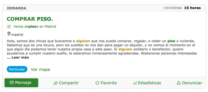 “Hola, somos dos chicas que buscamos a alguien que nos pueda comprar, regalar, o ceder un piso o vivienda”, comienza el breve texto, que se puede encontrar en Mil Anuncios dentro de la sección de venta de pisos en Madrid.