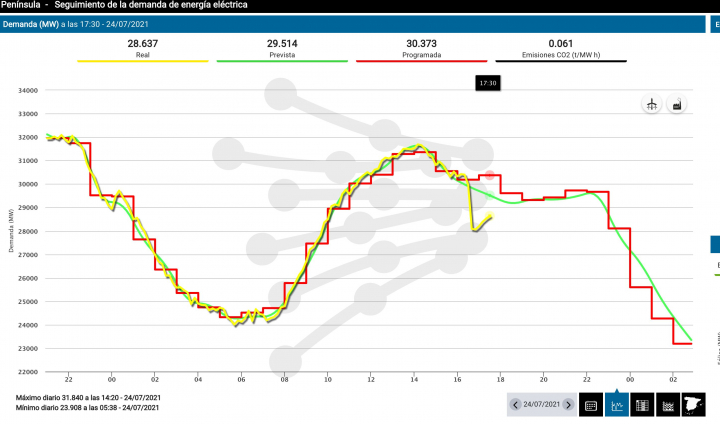 En los datos de demanda real de luz ofrecidos por Red Eléctrica se puede observar cómo sobre las 16:40 el consumo de luz cae en picado desde los 30.400 mw hasta los 28.000 en apenas minutos.