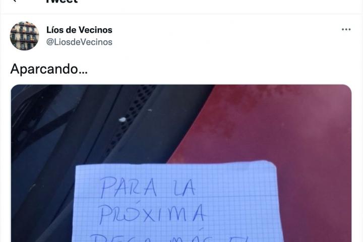 “Aparcando”, ha escrito @LiosdeVecinos para dar a conocer a sus más de 51.000 seguidores esta llamativa nota.