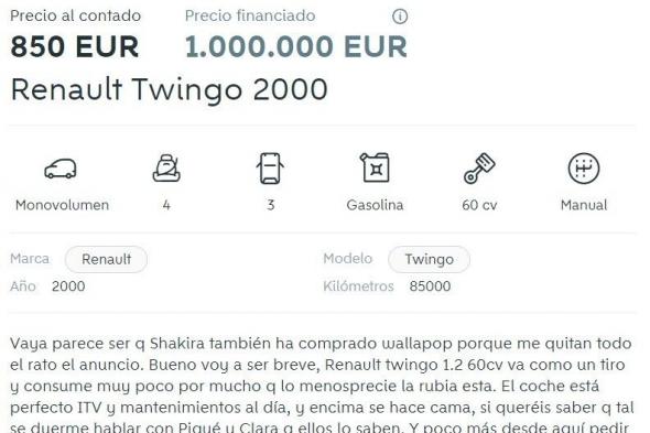 La descripción es para verla. “Vaya parece ser que Shakira también ha comprado Wallapop porque me quitan todo el rato el anuncio. Bueno voy a ser breve, Renault twingo 1.2 60cv va como un tiro y consume muy poco por mucho que lo menosprecie la rubia esta”, comienza.