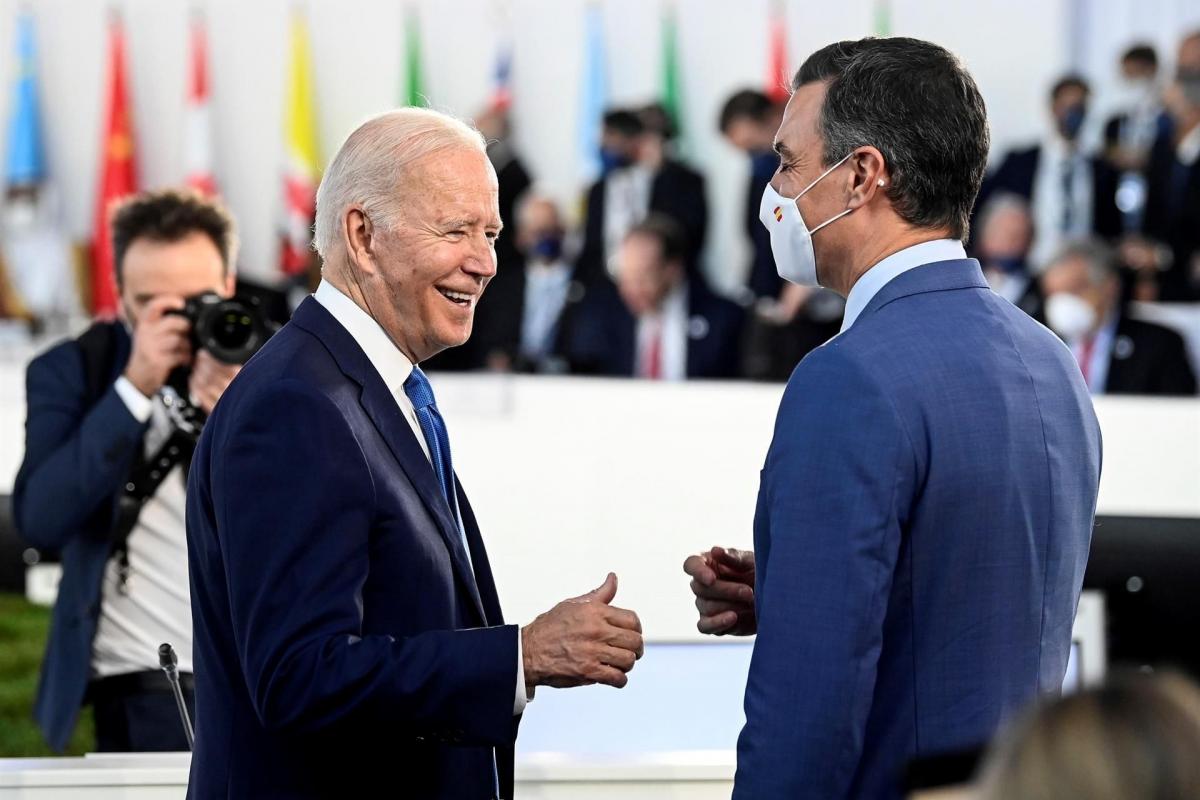 Sánchez y Biden participaron en la foto de familia de los asistentes a esta cumbre, y fue después, en el momento en el que los líderes iban a tomar asiento en la primera reunión conjunta, cuando los informadores gráficos pudieron captar ese saludo y esa charla distendida entre ambos.