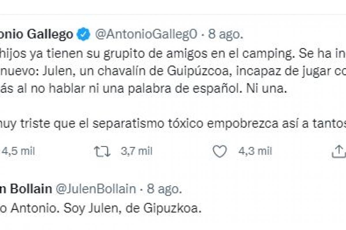 “Kaixo Antonio. Soy Julen, de Gipuzkoa. Crecí con la suerte de tener dos lenguas maternas: euskera y castellano. Actualmente, además, hablo inglés, alemán y francés. Solo quiero decirle que lo triste es la estrechez de su mente. Un abrazo”, ha escrito.