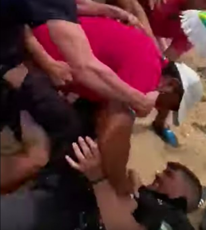 El forcejeo y posterior agresión se han producido en mitad del gentío que poblaba este miércoles a primera hora de la tarde la playa onubense. Junto a las imágenes pueden oírse gritos de histeria y miedo de varios testigos.