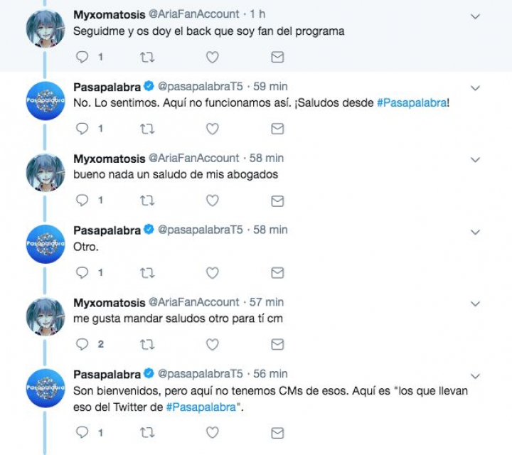 Llevar las redes sociales de un programa de televisión no tiene que ser fácil. Y si no, que se lo digan al CM “o los que llevan eso del Twitter” de Pasapalabra. El espacio de Telecinco suele responder a las cuestiones o comentarios que les hacen sus seguidores. Y si hay que entablar conversación, se hace.