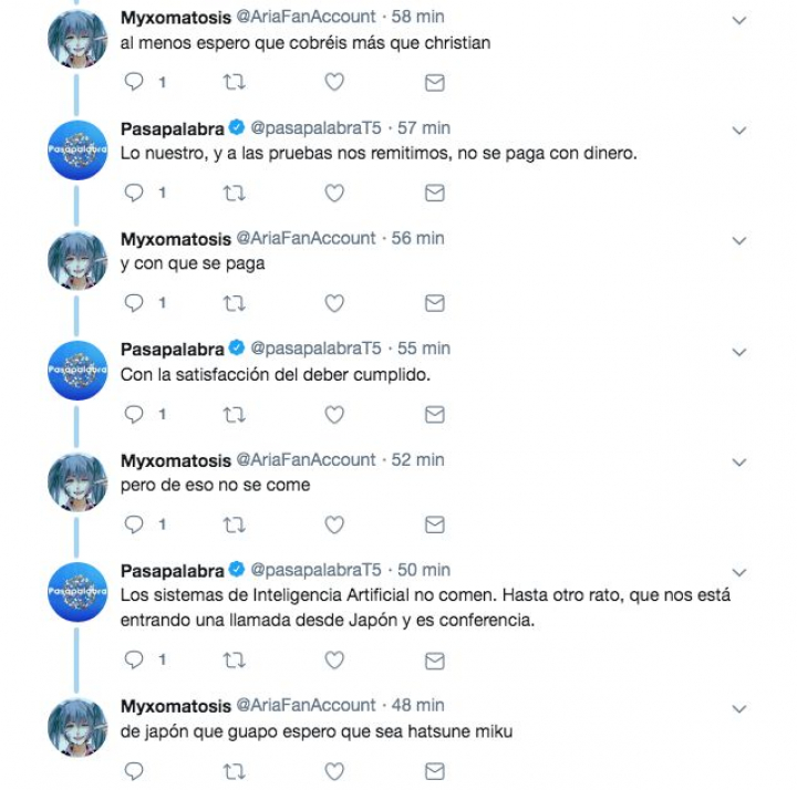 Y con esa mención a Japón ha acabado la extrañísima conversación. Suponemos que la cuenta oficial tenía más usuarios que contestar y más contenido que publicar. Lo dicho... “No se paga con dinero”.