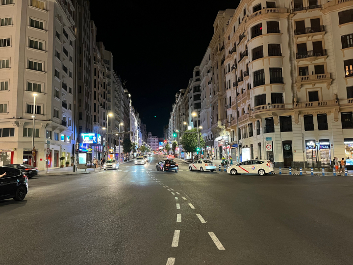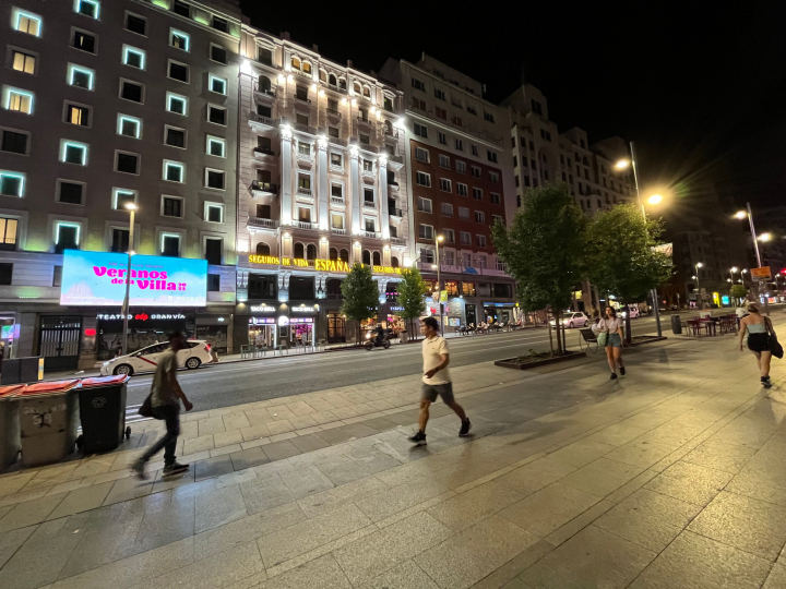 En la plaza de Callao, el bullicio habitual de gente no se había detenido por un instante y la vista de Gran Vía mostraba una silueta que contrastaba con la de fachadas apagadas de hoteles históricos con algunos establecimientos comerciales de comida todavía en funcionamiento y con luz. Todo ello marcado por los grandes letreros luminosos de los teatros y enormes paneles publicitarios encendidos en el ‘Broadway madrileño’. Cuestión última que dificultaba percatarse de la diferencia.