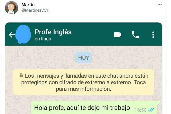 Blanco y en botella. El usuario @MartinezVCF_ ha difundido a través de su perfil de Twitter la conversación que ha mantenido por WhatsApp con su profesor de inglés. El éxito estaba garantizado y así ha sido: en cuestión de pocas horas ya ha superado el millar de me gusta.