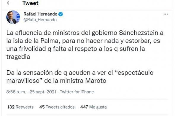 En su particular estilo, Hernando dice que el hecho de que los miembros del Gobierno acudan a la isla “es una frivolidad que falta al respeto a los que sufren la tragedia”.