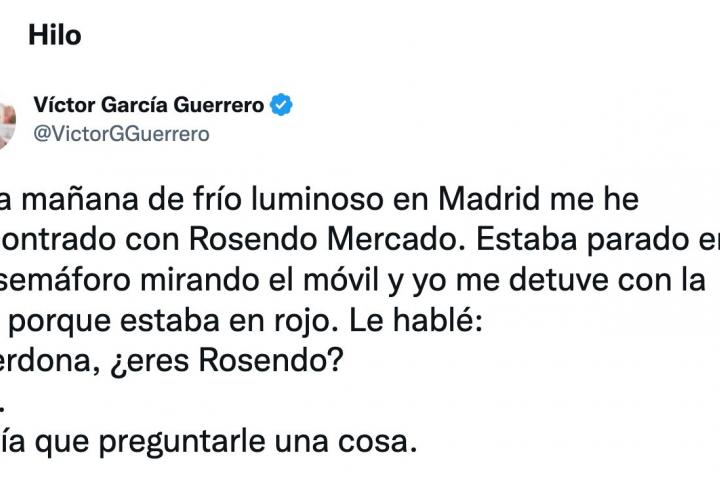 “Esta mañana de frío luminoso en Madrid me he encontrado con Rosendo Mercado. Estaba parado en un semáforo mirando el móvil y yo me detuve con la bici porque estaba en rojo. Le hablé: - Perdona, ¿eres Rosendo? - Sí. Tenía que preguntarle una cosa”, ha contado en un primer tuit.