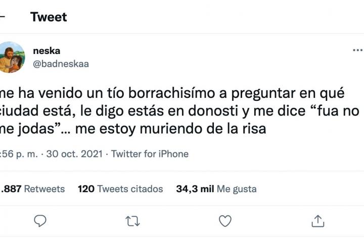 “Me ha venido un tío borrachisímo a preguntar en qué ciudad está, le digo estás en donosti y me dice “fua no me jodas”… me estoy muriendo de la risa”, ha explicado en el tuit viral.