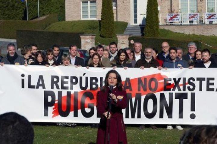 Junto a otros miembros de su partido que sostenían una pancarta en la que se podía leer "¡La República no existe, Puigdemont!", Arrimadas ha asegurado que su presencia en Waterloo, que ha sido muy criticada por el resto de formaciones, es para expresar justo lo que indicaba la pancarta: "que la República no existe".