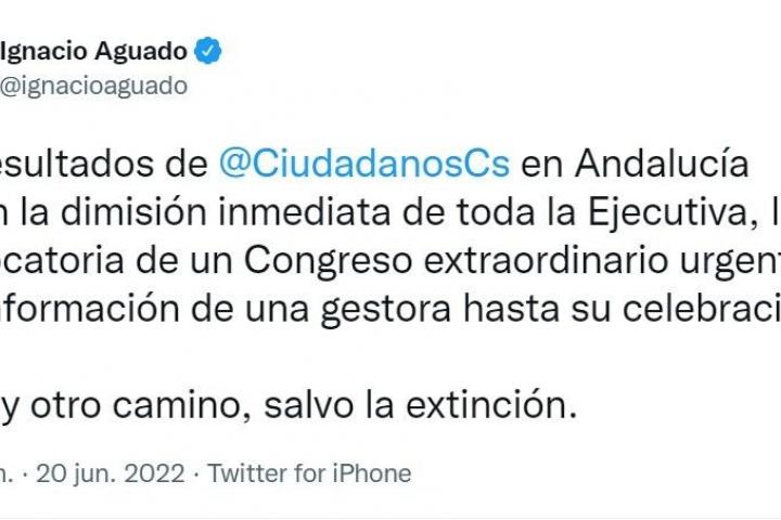 “Los resultados de Ciudadanos en Andalucía exigen la dimisión inmediata de toda la Ejecutiva, la convocatoria de un Congreso extraordinario urgente y la conformación de una gestora hasta su celebración. No hay otro camino, salvo la extinción”, escribió.
