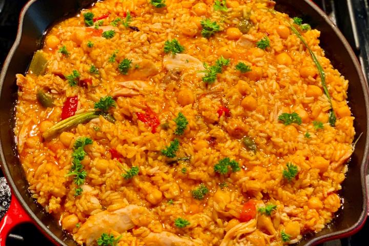 Poner el aceite en un marmita ancha y rehogar el resto de los vegetales cortados en brunoise durante 20 minutos. Añadir la salsa de tomate, el pollo deshilachado, el arroz y los garbanzos. Añadir el caldo de pollo y dejar cocer durante 17 minutos. A falta de 3 minutos incorporar junto al cilantro bien picado. Rectificar el punto de sal y pimienta.