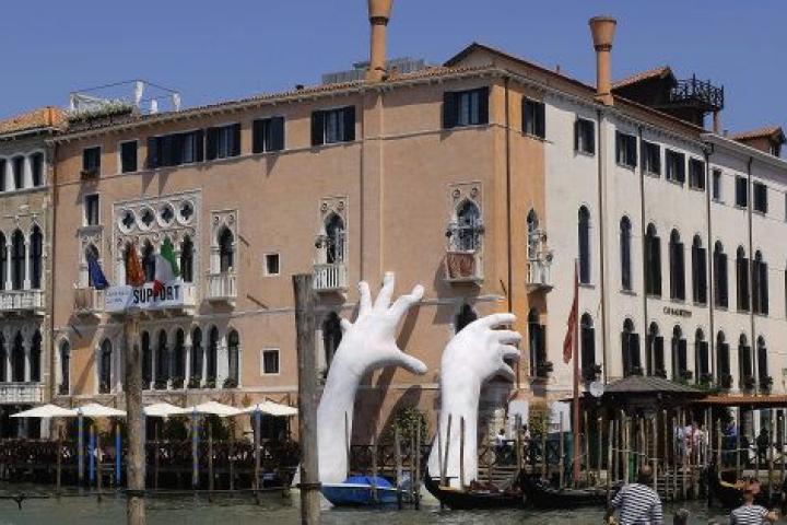 Unas enormes manos blancas que emergen del agua y se aferran a un edificio en el Gran Canal de Venecia. Una metáfora que busca concienciar sobre los efectos del cambio climático en la ciudad italiana, condenada a desaparecer si continua subiendo el nivel del mar. A su lado se puede leer la palabra Support —Apoyo— y el nombre de Lorenzo Quinn, creador de la obra.