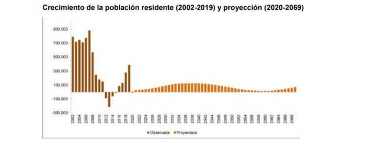 Con el horizonte en 2070, entonces fallecerán casi 250.000 personas más de las que nacerán, mientras que el saldo migratorio (inmigrantes menos emigrantes) aportará casi 300.000 nuevos ciudadanos en el país. Este cálculo sobre el movimiento de migrantes en la actualidad se mueve en cerca de 110.000 personas que entran en España más de las que la abandonan.